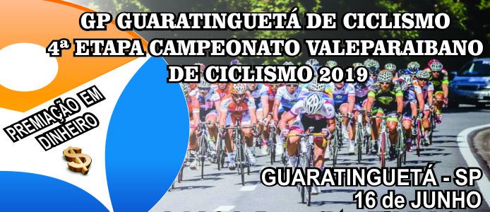 A LIDER - LIGA DE DESPORTOS DE RENDIMENTO E DE BASE DA CAPITAL VALE DO PARAIBA E LITORAL NORTE, EMX PROMOÇÕES E EVENTOS E ITALY EVENTS AND SOLUTIONS, através da SECRETARIA DE ESPORTES E SECRETARIA DE TRANSPORTES, realizarão no próximo dia 16/06/2019, A 4ª ETAPA DO CAMPEONATO VALEPARAIBANO DE CICLISMO 2019/GP GUARATINGUETA DE CICLISMO 2019.