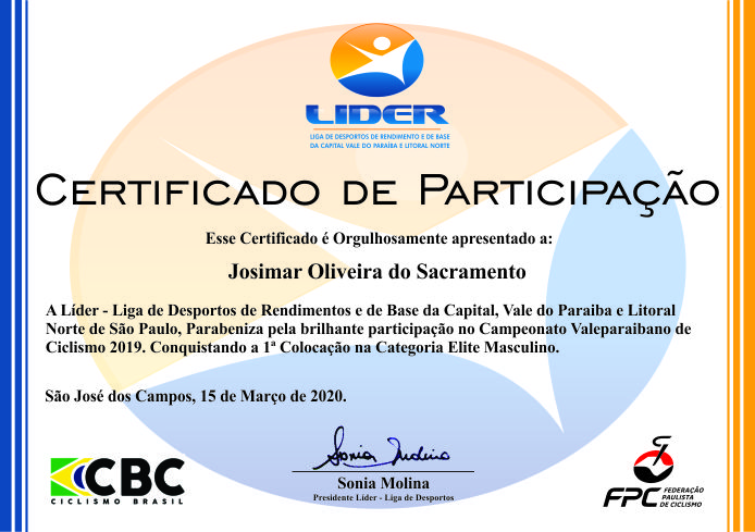 Com muito orgulho e carinho que a Líder - Liga de Desportos de Rendimento e de Base da Capital, Vale do Paraiba e Litoral Norte de São Paulo, preparou e agora disponibiliza online os Certificados do Campeonato Valeparaibano de Ciclismo 2019